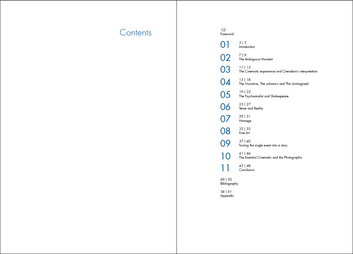 The appendix is heavily image based. It is paramount that the photographs have some priority here as they are referenced to and will need to be refereed to by the reader. Also because of the nature of GRegory Crewdson's photography, they deserve to be seen large format if not full bleed.
